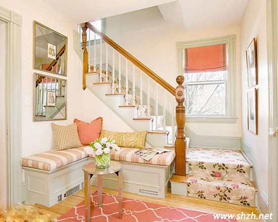 **色的玫瑰花鋪滿了整個樓梯,搭上家具的顏色搭配,打造一副田園甜美風格。地毯上精美的花紋與室內的色調相互融合,呈現明亮如春的居家氛圍。