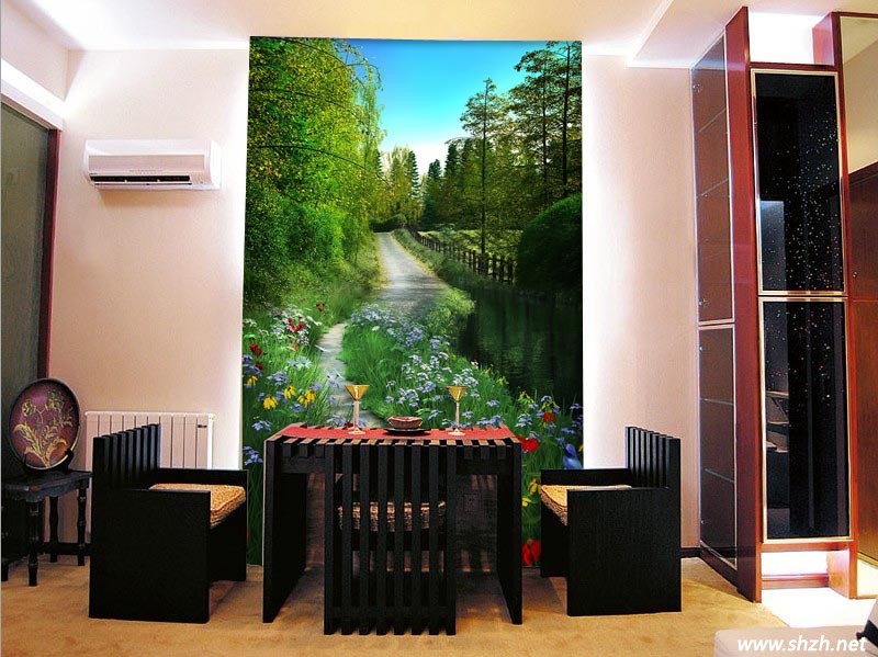 餐廳的背景墻,一般人都是掛上個(gè)性的圖畫來(lái)裝飾,但是換上噴繪墻紙呢,效果又是兩樣的吧,在無(wú)形中開闊了餐廳的空間,綿延不斷的小道,鮮艷奪目的野花,綠色的樹木,都給餐廳增加實(shí)實(shí)在在的春色。