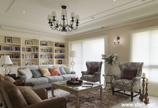 鐵制吊燈與深色皮革矮桌搭配淺色沙發(fā),對比色調(diào)讓空間表情豐富多元。而且還流露出一股歐式貴氣之風(fēng)。
