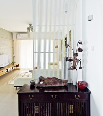白色的客廳里,白色的墻壁,白色的沙發(fā),白色的餐桌和餐椅,白色的門窗,白色的吊燈,如此干凈明朗的空間,讓人有一種放空的狀態(tài),仿佛將雜念也隨之一掃而空。除了顏色的簡致,家居用品也是簡單而實用、滿足最基本需求的,一套沙發(fā)、一個電視柜、一個淘回來的老木箱做的茶幾,便是客廳的全部家具,沒有一件多余的裝飾品。而就是如此簡單的空間,在完美的比例、和諧的色塊組構(gòu)下,透著一股從容不迫的舒雅與大氣。寧靜且井然有序,仿佛坐臥其間,便能凝神靜思。