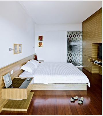 同樣坦蕩的性情,還體現(xiàn)在主臥長廊式的書柜上。擺脫常規(guī)的開放式書柜設(shè)計,也去掉了以書為飾的矯情。用封閉式的木門將長廊式的書柜遮擋得干干凈凈。而里面成堆的書籍,別樣的精彩成為私密享受,而非愉悅他人裝點自己的擺設(shè)。