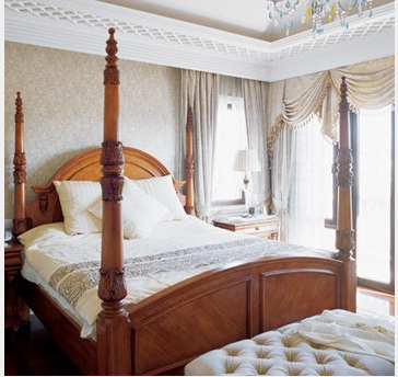 美式家具的好處之一就是尺度夠大。在這間臥室中,設(shè)計師為了讓眠者擁有充足的睡眠空間,刻意選擇了這種款式傳統(tǒng)的美式臥床。靜謐的環(huán)境是保證良好睡眠的前提,在保健醫(yī)生的建議下,地面設(shè)計采用了雙色拼花的原木地板,這樣的安排不僅協(xié)調(diào)了空間的視覺效果,也降低了步履行走所產(chǎn)生的分貝。
