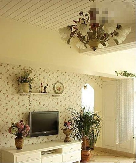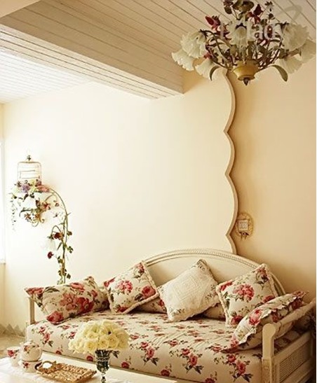 花瓣式的沙發(fā)背景透露了幾分甜蜜,給單調(diào)的白墻增添了不少分。用最小的投資打造最實用的效果。