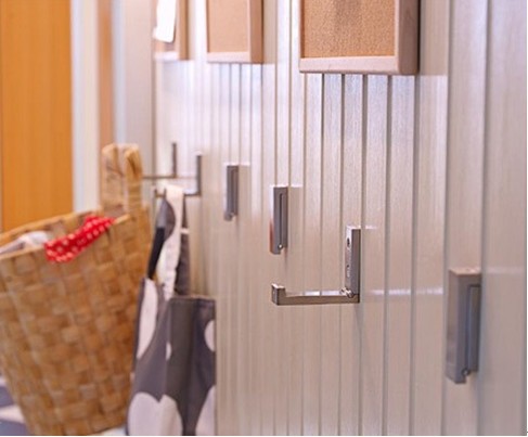 上方則專屬于是父母的儲物區(qū);另外,為了避免空間的浪費,在柜子中間空出的部分可以安裝一些小掛鉤,用來掛鑰匙或者雨傘等常用小物件。