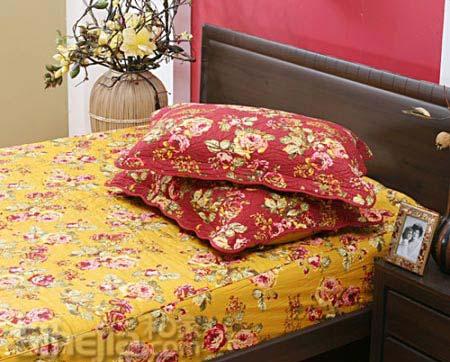 黃色為底床罩+紅色花朵靠枕 一幅田園氣息在臥室洋溢。以一種恬淡陶然的田園情懷再現(xiàn)精致浪漫的都市品質生活:聞著空氣中彌漫著愛的氣息,那一份溫馨,那一份感動,盡在這一瞬間。空間,因為得到釋放而精彩紛呈。