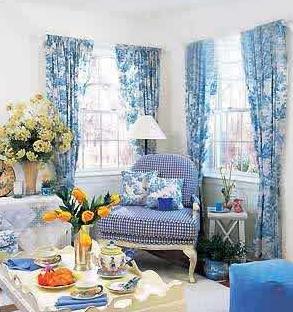 淡藍風格的小碎花布藝加上自然材質的裝飾再加上印有淡藍花色的茶杯。 家居里彌漫著優(yōu)雅的鄉(xiāng)村田園風格。淡淡藍白碎格子沙發(fā)透著鄉(xiāng)村風格的樸素,田園風格的木質茶幾,窗簾上那些淡藍色的碎花紋猶如手工描繪般細致。
