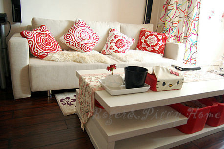 客廳兩組沙發(fā)茶幾的照片,紅與白相間,喜慶又不失時尚體面。