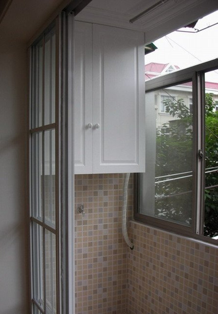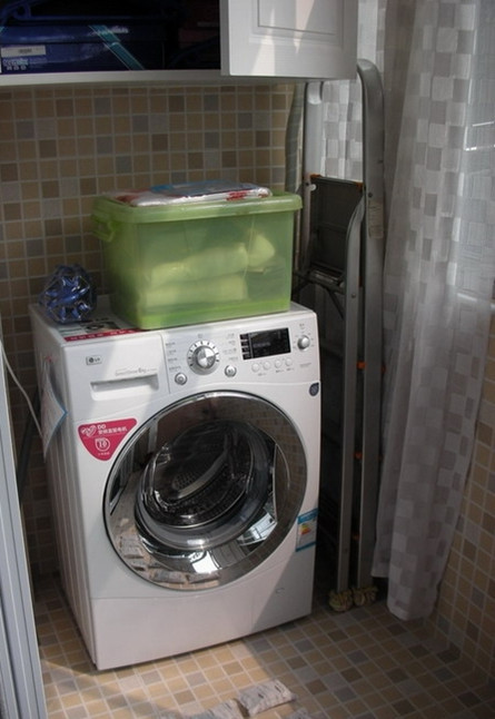 客廳外的陽臺上,洗衣機(jī)置放在這里,解決了衛(wèi)生間面積小的問題