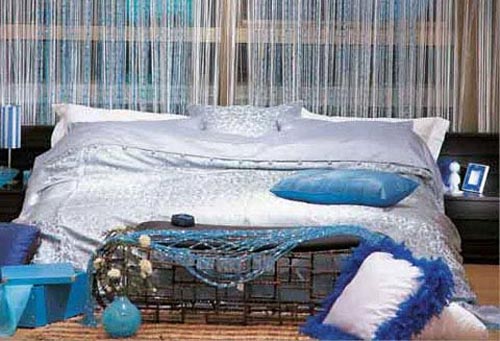 一間以藍(lán)色的珠簾、床品搭配白色垂線簾的臥室,在藍(lán)色的床頭燈、靠墊、小飾品和鐵藝床腳榻等的呼應(yīng)下,感覺如瀕海而居,不知不覺中,仿佛不時(shí)還有海風(fēng)拂過。
