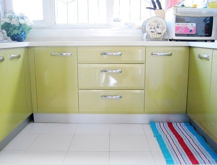 果綠色系的廚房,干凈又明亮,彩條防滑地毯,是貼心的設(shè)計。