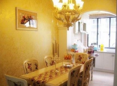 餐廳,廚房是開方式的,客廳餐廳廚房都是連在一起了,餐廳和客廳墻面是做的金面復古的藝術墻,相對墻紙來說不會脫落,臟了擦也比較容易