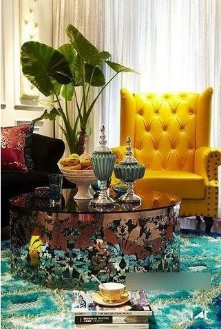 金黃色的沙發(fā),黑色的不銹鋼茶幾,特別的給力,視覺沖擊很強。