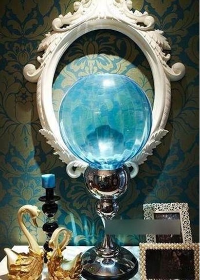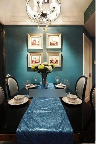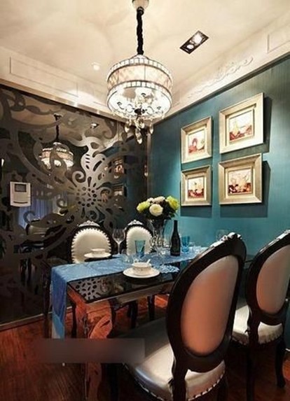餐廳的吊燈是水晶的,這是不能錯過的,整面墻是帶點藍色的。