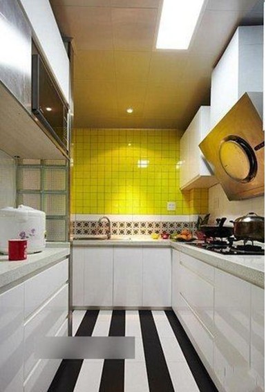 廚房,整面墻都是黃色的,貼了黃色的瓷磚。