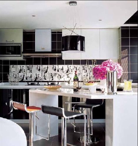 廚房間的吧臺,時髦女郎男女居家中的最愛。黑白插畫瓷磚,改變了黑白基調(diào)的沉默嚴肅,使房間變得輕松,浪漫。廚房這個沒有浪漫氣氛的地方也可以生出浪漫的感覺。