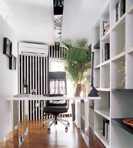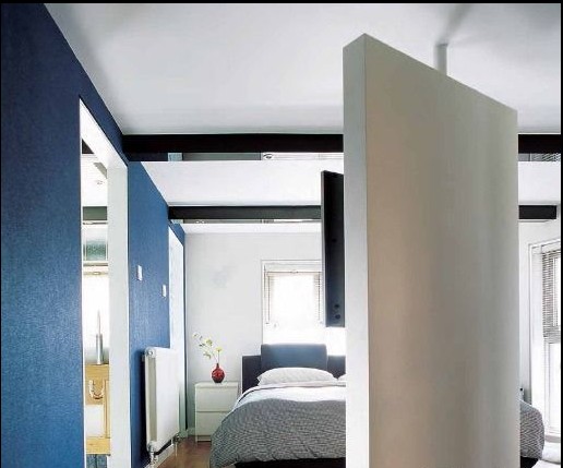 中戶型空間不大,所以在空間規(guī)劃上得特別細心??臻g小并不代表不精彩,一道轉(zhuǎn)墻的設計成為二層空間最大的亮點。分隔書房與臥室空間的是兩道半墻,其中一道可以自如旋轉(zhuǎn),關(guān)閉時,兩個空間各自獨立,看電視的與看書的各不影響;而打開時,兩個空間相互貫通,隔離而不疏離。