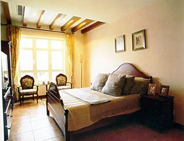 掛畫和壁燈:掛畫相對于墻面來說依然要置于前景,所以選用了更深于墻面的咖啡色做邊框色,里面裝裱了一幅不淡不濃的畫。壁燈其實(shí)就是燭臺,花草枝蔓自然生長形成的攀巖效果和窗簾布藝、坐椅布藝相呼應(yīng)。