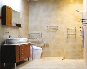 潔具:木色衛(wèi)浴柜符合老年人的色彩需求,柜體上雙手盆的選用充分體現(xiàn)了人性化的細(xì)節(jié),同時(shí)特別選用智能馬桶,融清潔、除臭、照明等功能為一身,馬桶旁專門設(shè)計(jì)雙側(cè)扶手,充分滿足了老年人的生活需要。