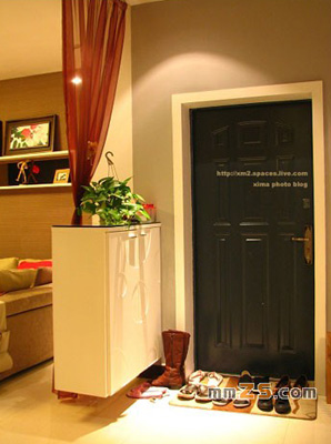 “進(jìn)門脫鞋”,這已經(jīng)成為當(dāng)今城市生活的一種模式。對于主人來說,"鞋子"仿佛是一種束縛,在進(jìn)入私有而熟悉的地方,人們會迫不及待地把它脫下。站在訪客的一方,為免鞋子所粘上的灰塵帶進(jìn)屋內(nèi),也會禮貌地解脫鞋子的。其次是美感方面,鞋柜能將雜亂的鞋子有次序地排列,化零亂為整齊。可謂一舉兩得。因此,鞋柜便成為玄關(guān)上必有或僅有的主角。有些鞋柜靠墻設(shè)置,在考慮它的實用性的同時,利用裝飾線條、燈光效果等來體現(xiàn)藝術(shù)效果。有些置中的鞋柜常常與玻璃隔墻結(jié)合在一起,半截鞋柜、半截透明或半透明的藝術(shù)玻璃隔斷,讓穩(wěn)重與明快對話,讓玻璃阻隔直接透視室內(nèi)的目光,既體現(xiàn)"家"的私密性,又不失大方感。