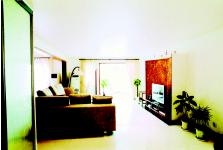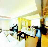 本案為大戶型的客廳,設(shè)計師將客廳與茶室的隔墻打開,陽臺、客廳與茶室渾然一體。取消客廳的主視燈而代以頂面筒燈,莎朗娜米色地面、弧形西班牙軟木電視背景墻、弓形落地?zé)艏皢】诘暮椭C與呼應(yīng),渲泄出業(yè)主大度和內(nèi)斂的氣質(zhì)。