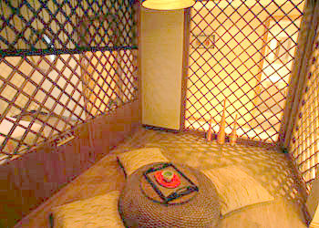 茶室里一個(gè)小滕桌,幾個(gè)靠背墊,散發(fā)著典雅古樸的中式風(fēng)情。