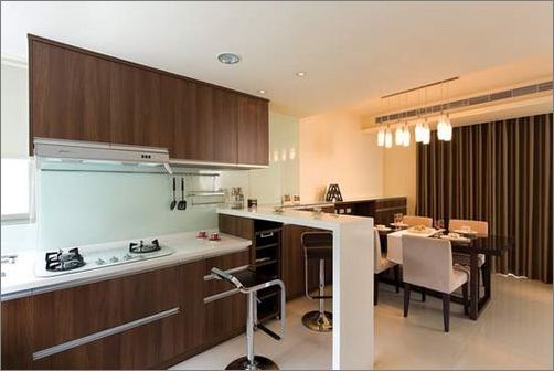 開放式廚房就是要求廚房不封閉,與其他空間,主要是餐廳能夠合二為一。這樣做不僅能夠起到很好的裝飾效果,整體的生活品位也會(huì)相應(yīng)提高。這么做最大的弊病就是無(wú)法控制油煙??墒侵灰銚Q個(gè)思路,將廚房墻壁做成透明的,就可以既控制了油煙,又保證了視覺上的通透。
