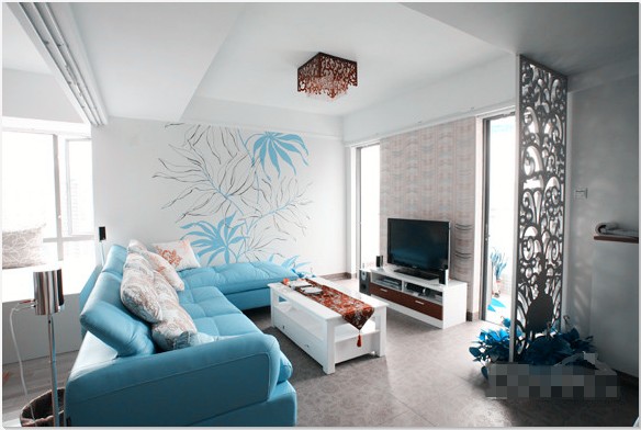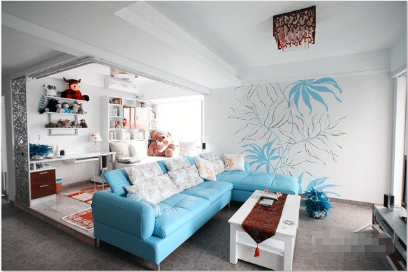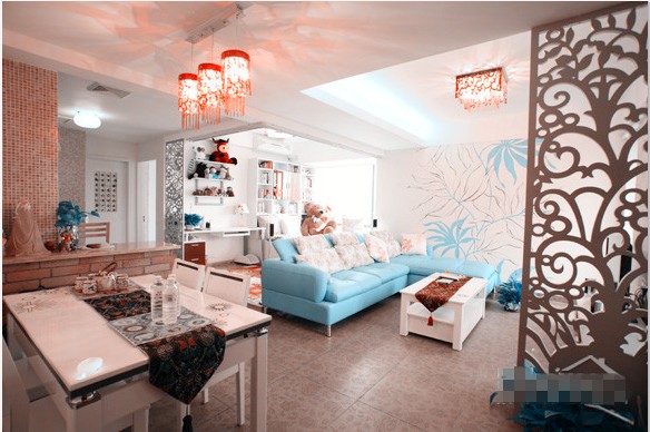 整個客廳的采光很好,讓人的心情也隨之陽光起來。色彩的運用使客廳和過道渾然天成。簡單的布置,沙發(fā),茶幾,電視滿足了最基本的閑暇娛樂時光。電視柜上的布簾,隨意擺放的靠墊,都選擇了大花型圖案,頓時打破了空間的單一感。