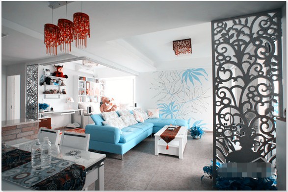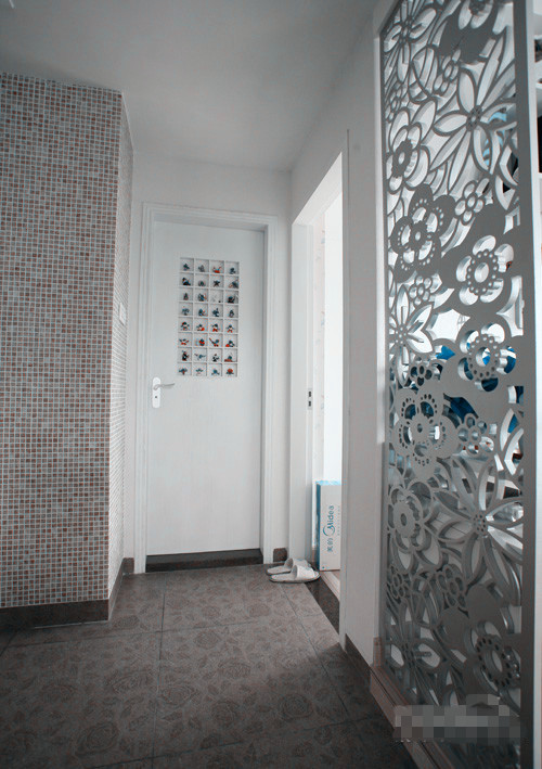 陽臺過道簡約鏤花隔斷,讓空間更富有層次感,時尚而精致。門面上的五彩小玩偶,時尚感的空間內(nèi)增添一絲樂趣。地面印滿玫瑰花的仿古地磚也別具一格。