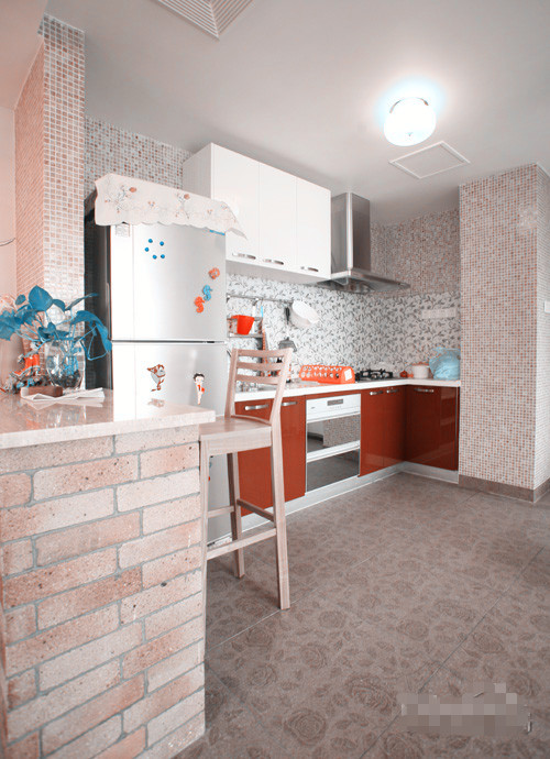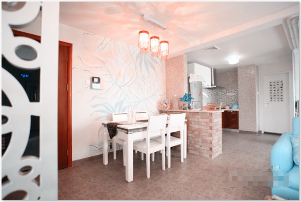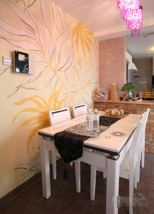 客廳一角,即被做成餐廳,墻面延伸了客廳背景墻的藤蔓花紋;略帶歐式風(fēng)格裝飾的四方桌為餐桌,用紅磚砌成的隔斷墻面將空間完美的分割開來。