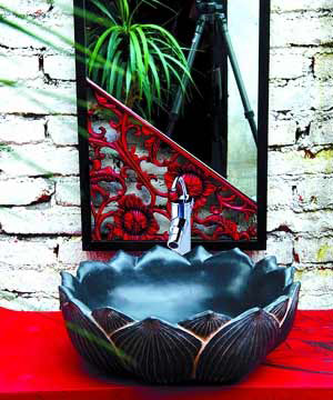 荷花容易讓人想到意境悠遠的環(huán)境,荷花造型的手盆更容易讓人產(chǎn)生無盡遐想。黑色給手盆增添了厚重,光滑的內(nèi)部讓人感覺到石藝的溫潤,這樣的手盆搭配紅色古典浴室柜給人幽香的感覺。