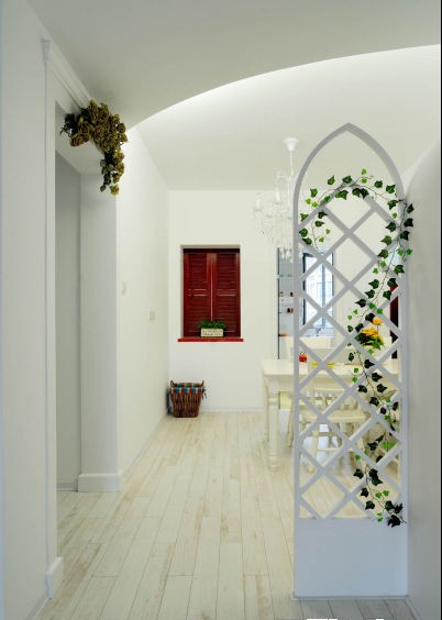 韓式田園總讓人感覺很多花飾裝飾,在這個(gè)案例里面,卻是很少。玄關(guān)處的隔斷多了一絲韓式韻味,也為小家的裝飾增添一分力量。