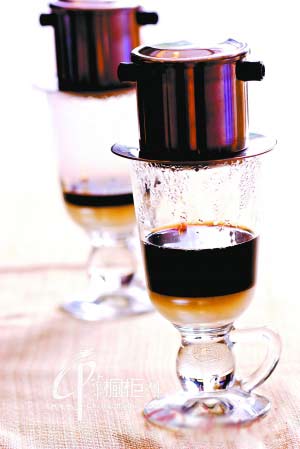 越南的咖啡風(fēng)情很大程度在于其沖泡過(guò)程,它不是用咖啡壺煮,而是一種特殊的滴濾咖啡杯,下面用樣式古老的印花玻璃杯接著,就像沙漏在計(jì)時(shí)一樣,一滴一滴都用來(lái)消磨曼妙時(shí)光。做的時(shí)候下面的玻璃杯杯口架上滴漏杯,在滴漏里面放咖啡粉,壓上一片有洞孔的金屬片,再用熱水沖泡,讓咖啡滴滴答答的滴到杯子內(nèi)。講究一點(diǎn)的做熱咖啡時(shí)把杯子架在一個(gè)加滿開(kāi)水的大碗里保溫,因?yàn)榈瓮暌槐Х瓤赡芤檬昼?,熱咖啡?huì)涼掉。有人喜歡在杯子底下加一層很甜很甜的煉乳,等咖啡都滴到杯子里,再把咖啡和白煉乳混合起來(lái)喝。如果是黑咖啡,一般不給你吸管,如果是有煉乳的就會(huì)給你吸管。只有那些耐得住性子的人,才會(huì)等待到一杯咖啡滴完了,再慢慢吞吞地喝下去,領(lǐng)略到慢活的美妙。