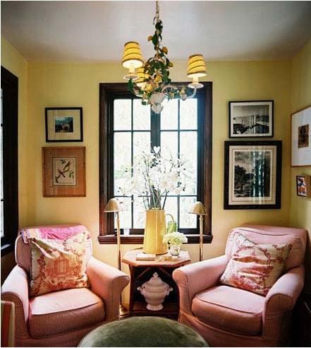 暖暖的淡黃色墻面給人以溫暖,讓房間顯得溫暖自然,絨布的圓凳和粉色條紋布藝沙發(fā) ,整個(gè)空間充滿美式田園的味道。曬曬太陽,喝喝茶,看看書,或者午小酣一下這里都是非常好的選擇地點(diǎn)。