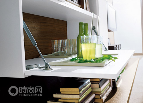 圖為廳柜可以包含多種功能,翻下折板還可以享受休閑的暢飲時(shí)間。