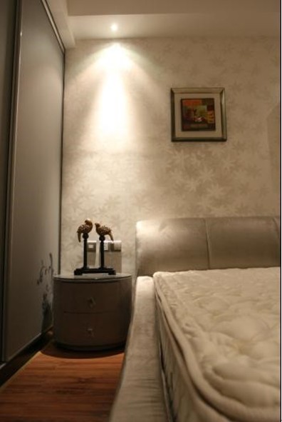 床頭那裝飾物在射燈的投射下,顯得格外的亮眼。它似乎又是愛情的見證物,比翼雙飛、不離不棄。