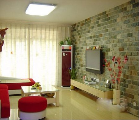 這個(gè)類似外墻磚的背景墻是客廳的一大特色,時(shí)尚自然。且非常有個(gè)性特色。