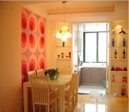 餐廳的色調(diào)是以溫馨為主打。在燈光的陪襯下更顯溫馨。餐廳的背景墻比較的有個(gè)性,既美觀也有裝飾效果。餐廳跟廚房的中間做了一個(gè)隔斷,可以做收納用,這里現(xiàn)在做飲料酒水的儲(chǔ)存地。