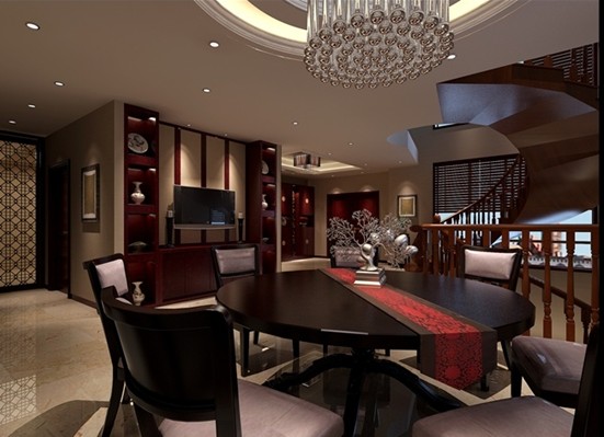 餐廳依然選擇傳統(tǒng)中式風(fēng)格中的全木結(jié)構(gòu)的設(shè)計,以突出其業(yè)主的穩(wěn)重和品味。整個空間圍繞圓形紅木餐桌逐步展開,從餐桌到燈頂?shù)剿?,整個空間呈現(xiàn)天圓地方的形式展現(xiàn)在我們的面前,莊重與優(yōu)雅的相結(jié)合,勾勒出中國民族特色文化和韻味。