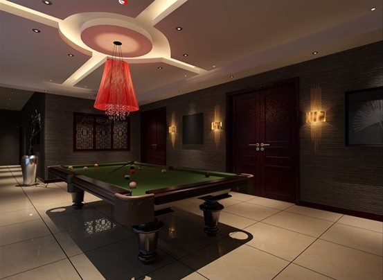 休閑區(qū) 昏暗的燈光下,一盞紅色的吊燈立即吸引了人們的眼球,把人的視覺立刻聚斂到空間中間的臺球桌上。