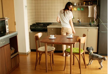 小餐廳與廚房是在一起的,水池與操作臺連著煤氣,加上冰箱的擺放位置正好是這個空間里的整體長度,一點空間都沒浪費出來。廚房用具里的瓶瓶灌灌都有序的擺放在掛勾上。操作臺的下方是定制的廚柜,空間分明,可以根據(jù)要求,擺放不同的物品。餐桌的是精挑細(xì)選的哦,90公分長不到,兩個精致小巧的木質(zhì)餐椅。