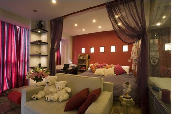 臥室背景墻的色彩是浪漫多情暖色調(diào),并不是單一色彩,特意用乳膠漆調(diào)配而成,效果很不錯(cuò)哦。幾個(gè)留白的地方,似乎是無意又有幾分刻意在。臥室與客廳相隔的是兩塊紫色輕紗,為浪漫氛圍更加一層。臥床兩邊沒有像一般人家常見的床頭柜而作為收納用,可以用為圖書置放處,為了節(jié)省空間。