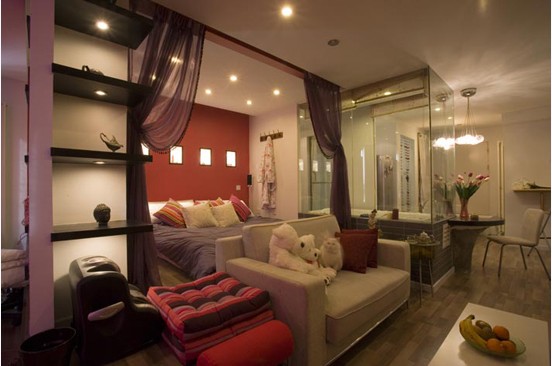 紫色輕紗隔開了臥室與客廳的空間,休憩區(qū)域,改電視主題墻為主題柜,這樣可以大大的增強(qiáng)收納空間。在沙發(fā)位置的地臺旁邊增加一根立柱成了他們倆在家里營造曲徑通幽氛圍的法寶。它不僅區(qū)隔了臥室與客廳休閑的區(qū)域,還行成了另外一個(gè)展示空間;有了這根柱子,方正的小房子也有了層次,更讓分隔休息和休閑區(qū)域的紗簾有了延伸的依靠。