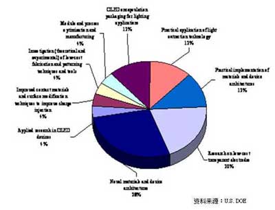 美國在OLED照明的項目研發(fā)計劃共有25項,其中相關OLED照明核心技術的項目有15項,共投入2030萬美元研發(fā)經費,OLED照明產品開發(fā)的項目有10項,共投入1660萬美元研發(fā)經費。其中有關發(fā)光材料的研究就有7項項目研發(fā),投入經費為860萬美元,占全部OLED照明項目研究的28%,為投入最多研發(fā)項目及經費的項目(圖二);透明導電層的研究也有5項項目研發(fā),投入經費為520萬美元,占全部OLED照明項目研究的20%,為投入第二高的研發(fā)項目及經費的項目。其余投入在材料表面改善、OLED照明器件應用、低成本封裝及OLED照明產品開發(fā)等項目研究,共投入2310萬美元研發(fā)經費。從OLED照明項目數(shù)及投入研發(fā)經費分布,可見OLED照明目前主要的困難點為OLED照明發(fā)光材料的特性提升及透明導電層的改善,所以美國能源部投入較多資源,成立更多研究項目,以期可以盡快解決目前OLED照明所遇到的問題。