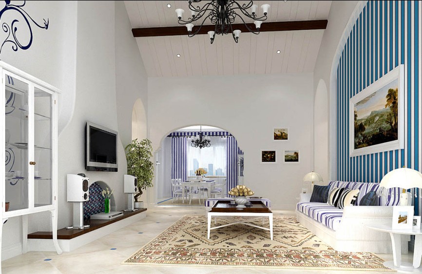 藍(lán)白條紋相間的家居用品在白泥灰墻的裝飾下變得純美。巨大的拱形門窗讓整個(gè)客廳顯得光線極好,藍(lán)白相間的色彩亦空間變得張力十足,無形中客廳在無限放大。