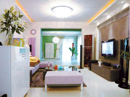 女主人非常喜歡紫色,沙發(fā)、電器等選購的都是紫紅色。因此設(shè)計(jì)師用淡紫色壁紙鋪帖電視背景墻,使硬裝修部分和家具搭配很協(xié)調(diào),營造出浪漫嫵媚的效果。同時(shí)馬賽克做電視背景墻也是一大創(chuàng)新,馬賽克流暢的線條感和時(shí)尚的大花壁紙個(gè)性化地搭配在一起,巧妙地呈現(xiàn)出優(yōu)雅時(shí)尚的墻面層次。