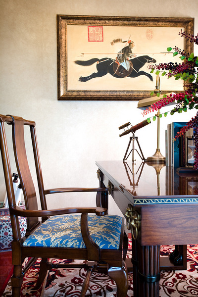 男主人書房里,中式傳統(tǒng)得以充分體現(xiàn)。無論是墻面的裝飾畫,亦是椅子面的中式傳統(tǒng)圖案花紋。