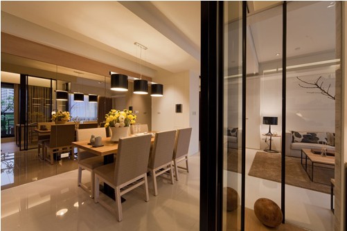 餐廳是家居生活的心臟,不僅要美觀,更重要的實(shí)用性,整體性。餐廳的燈光很重要既不能太強(qiáng)又不能太弱,燈光則以溫馨和暖的黃色為基調(diào),頂部做了簡(jiǎn)單的吊頂。由于空間不是很寬,因此把餐區(qū)面墻做成一整面墻的鏡子,讓人坐在其中不覺(jué)得壓抑,有了這面鏡子,更顯得餐區(qū)有了生氣,餐區(qū)的地面采用的是米白色拋光磚。
