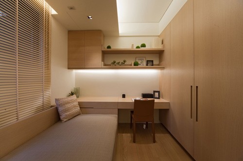 書房兼書房,此房間做了簡(jiǎn)單的天花造型,頂上藏?zé)魩?。由于空間不是很大,房間做了一排壁柜就只能放一張小床了。有了這間小房間讓親戚朋友來(lái)家可以做一個(gè)睡房,沒(méi)客人就把它當(dāng)書房,既方便又使用。