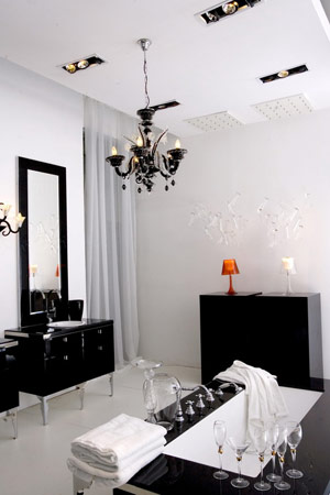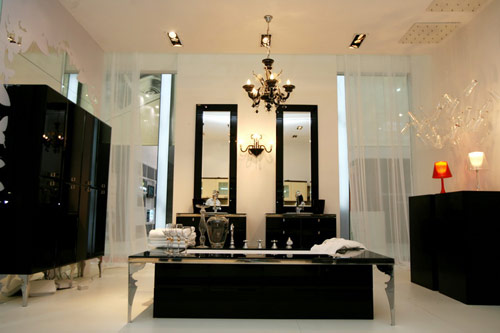 這一系列采用白、黑、紅色塊的大面積應(yīng)用,造型復(fù)古又時(shí)尚,烤漆玻璃與高光漆面技術(shù)的結(jié)合正是今年米蘭展的主流風(fēng)尚。