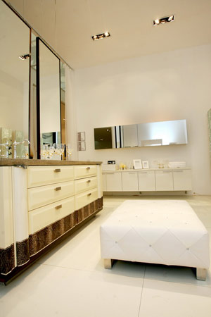 在浴室里擺放一件沙發(fā)隨時(shí)享受溫暖和舒適已不再是夢(mèng)想,象牙白混油高光的意德法家圖蘭朵浴室柜系列即擁有這一配置:皮質(zhì)扣釘?shù)拈L(zhǎng)條沙發(fā),矮矮地放置在浴室鏡與浴缸之間,可于浴后小坐品一杯紅酒、也可于優(yōu)雅轉(zhuǎn)身間稍事休息并放置物品,造型輕巧,可移動(dòng)到任何角落。